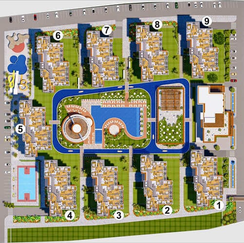 400 meters-long Gondola canal 500m² Outdoor Swimming Pool Indoor Pool Spa Center Gym Basketball Court Children’s Swimming Pool Children’s Playgrounds Aqua Park Massage Rooms Sauna Turkish Bath 5 different Konstepte Restaurants Rooftop Bar Shopping Center Amphitheater Open and Covered Parking Lot